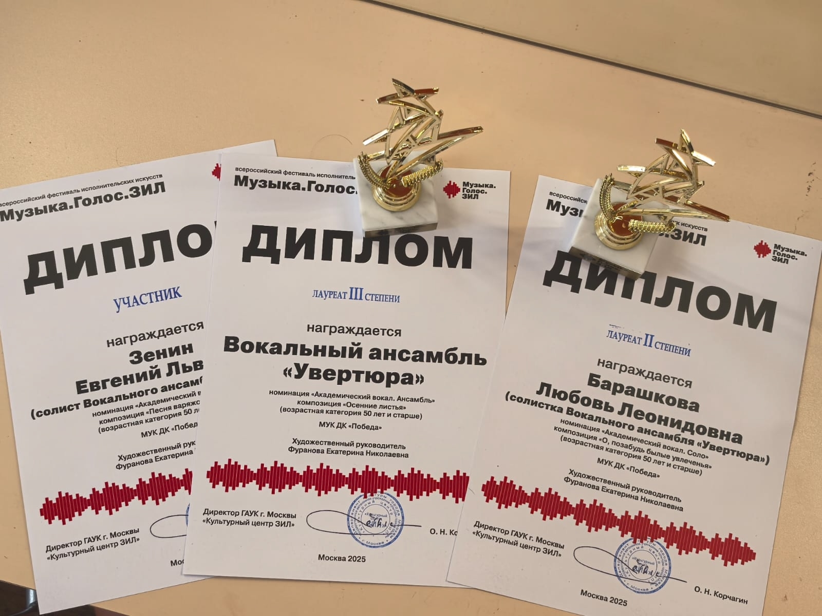 Поздравляем Любовь Леонидовну Барашкову со званием лауреата 2 степени в подгруппе исполнителей 50 лет и старше. Жюри конкурса отметила и работу всего Вокального ансамбля «Увертюра». Вот такими талантами богаты коллективы ДК «Победа».